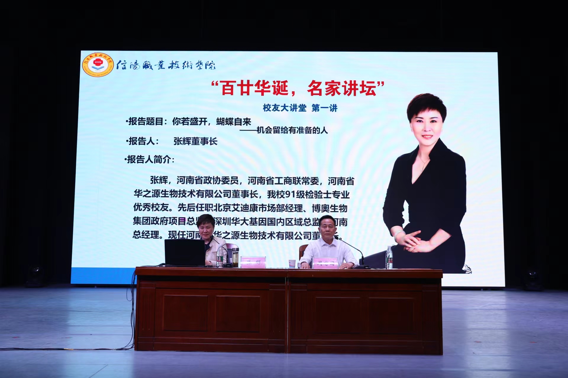 张辉校友作了主题为《你若盛开,蝴蝶自来——机会留给有准备的人》的专题报告,她以信阳职业技术学院校训及创业、创新、敬业三大精神为起点,重点为在座师生讲述了大学生毕业后职业规划、检验行业未来发展趋势及自主创业奋斗历程。张辉校友用自己的经历勉励同学们树立正确的专业思想和择业观,不断提升自己,抓住人生成长成功的机会,成就出彩人生、贡献伟大时代。特别是讲到2020年8月听从政府号召,带团队赴新疆克拉玛依市独山子区执行新冠病毒核酸筛查任务的故事,获得了现场热烈的掌声,现场师生深受感动和启发。