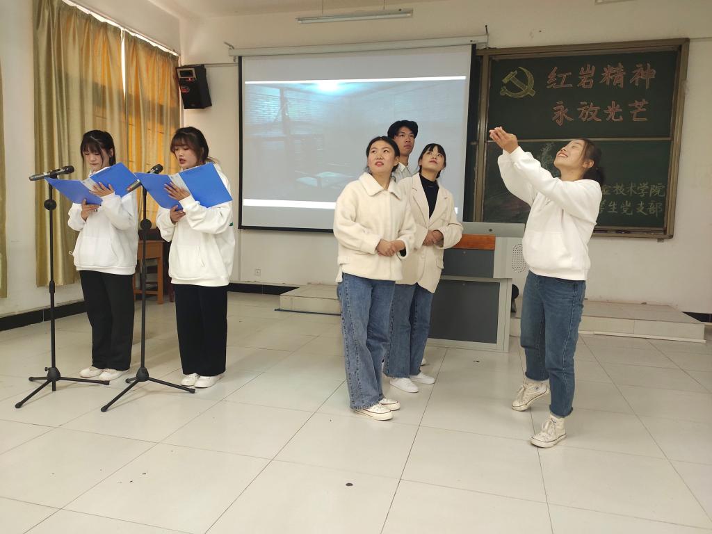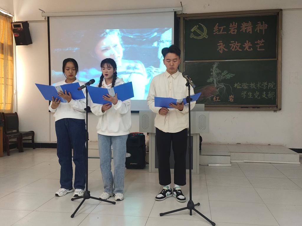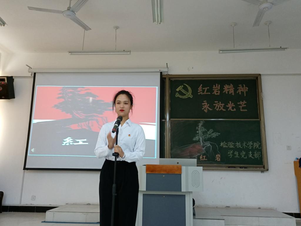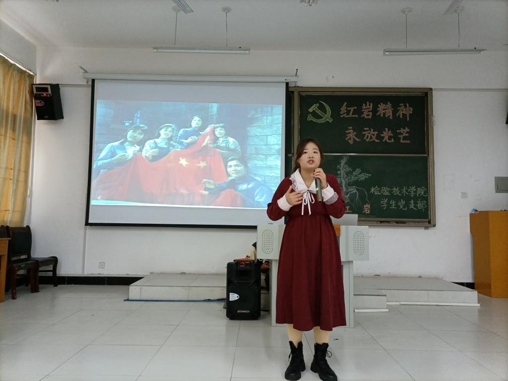 活动中,学生党员、发展对象、入党积极分子们声情并茂的讲红岩故事、唱红岩歌曲、颂红岩精神、演红岩片段。《江姐的故事》、《传承》等故事朗诵,《小萝卜头》等情景剧,《红梅赞》、《绣红旗》等独唱,《故事里的中国---红岩》等话剧,再现了关押在“白公馆”和“渣滓洞”的先烈们英勇无畏的革命精神,以及他们对共产主义的执着,对黑暗必将被打破、光明一定到来的坚信不疑。台下的师生时而静心聆听,时而鼓掌致敬,充满着对先烈们的崇敬和怀念。