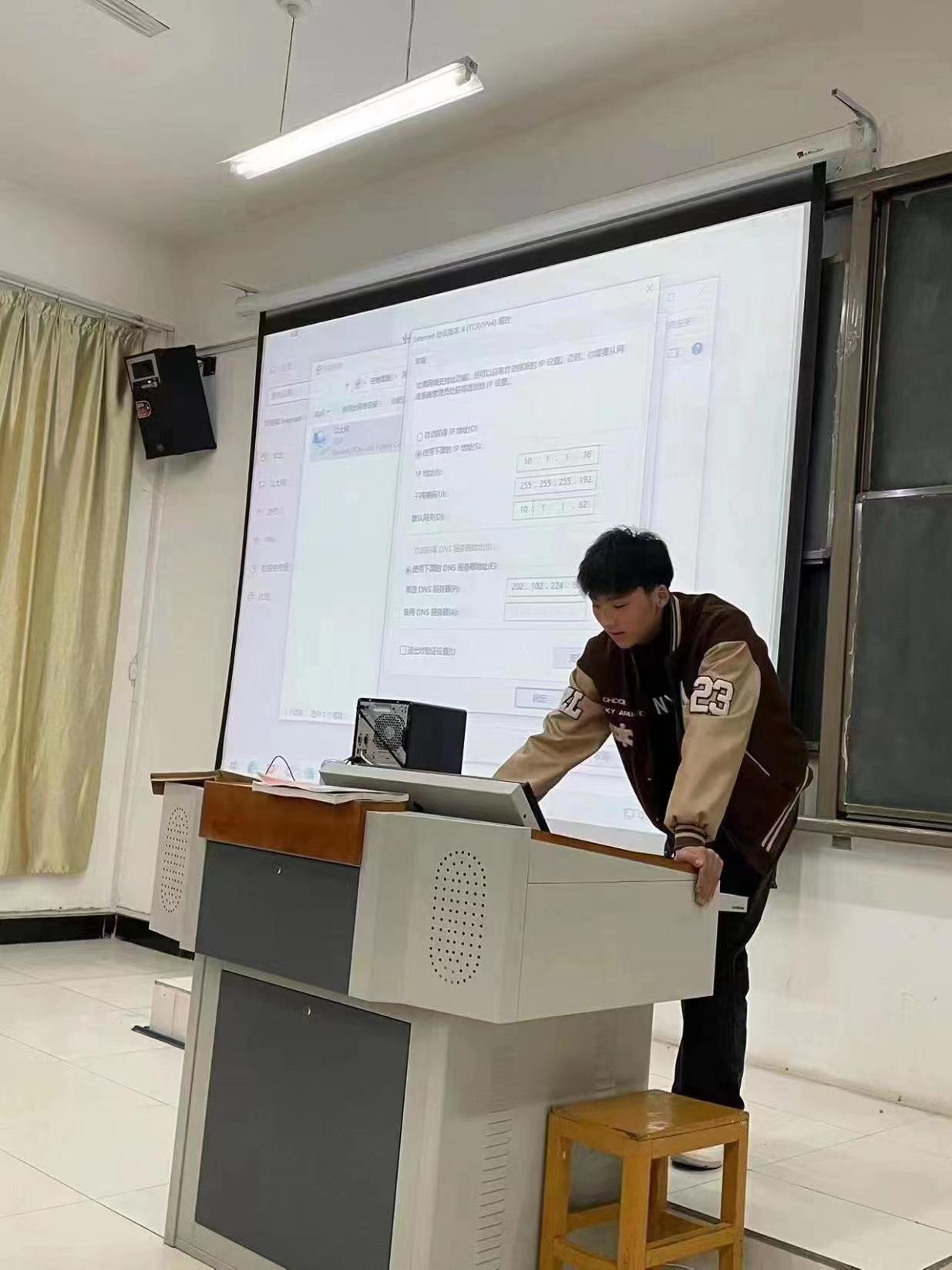 接着,刘永康同学讲解了关于使用日常维护方面的知识,详细讲解了处理电脑死机、投影仪连接不成功、网络不流畅等问题,在他的示范和鼓励下,学习委员们也都纷纷上前切身体验了具体的维修操作。