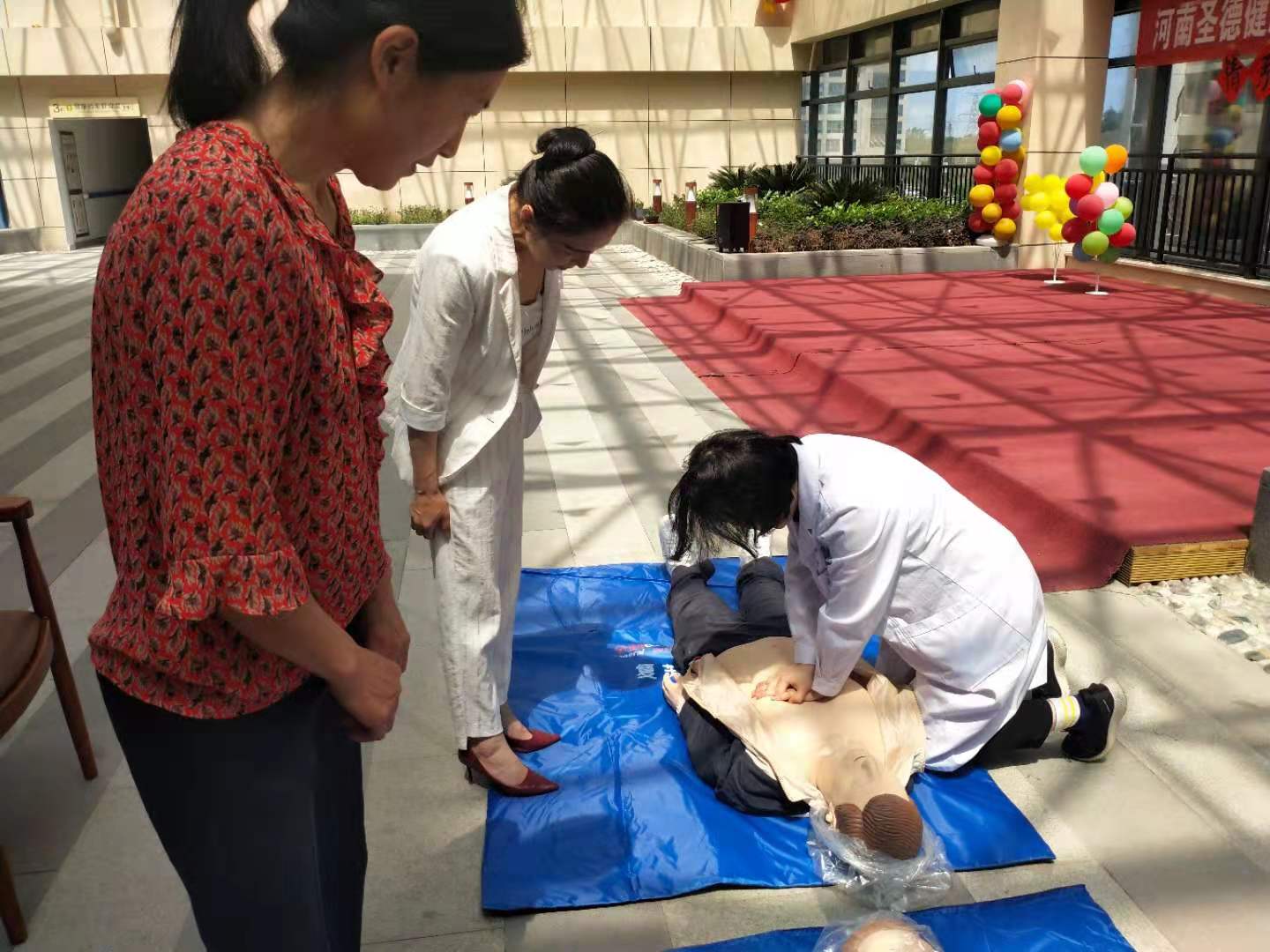 康梦叶老师针对老年人易出现心脏、呼吸骤停现象,结合养老中心的需求对工作人员进行心肺复苏急救术的培训。