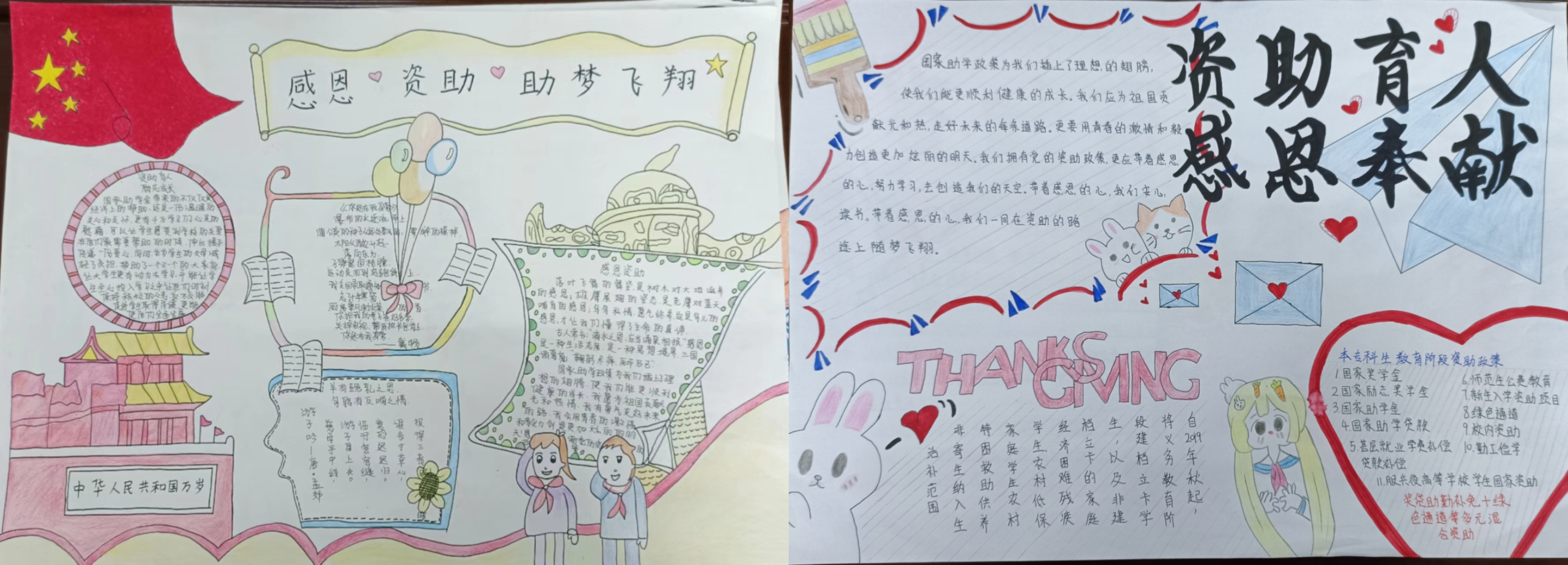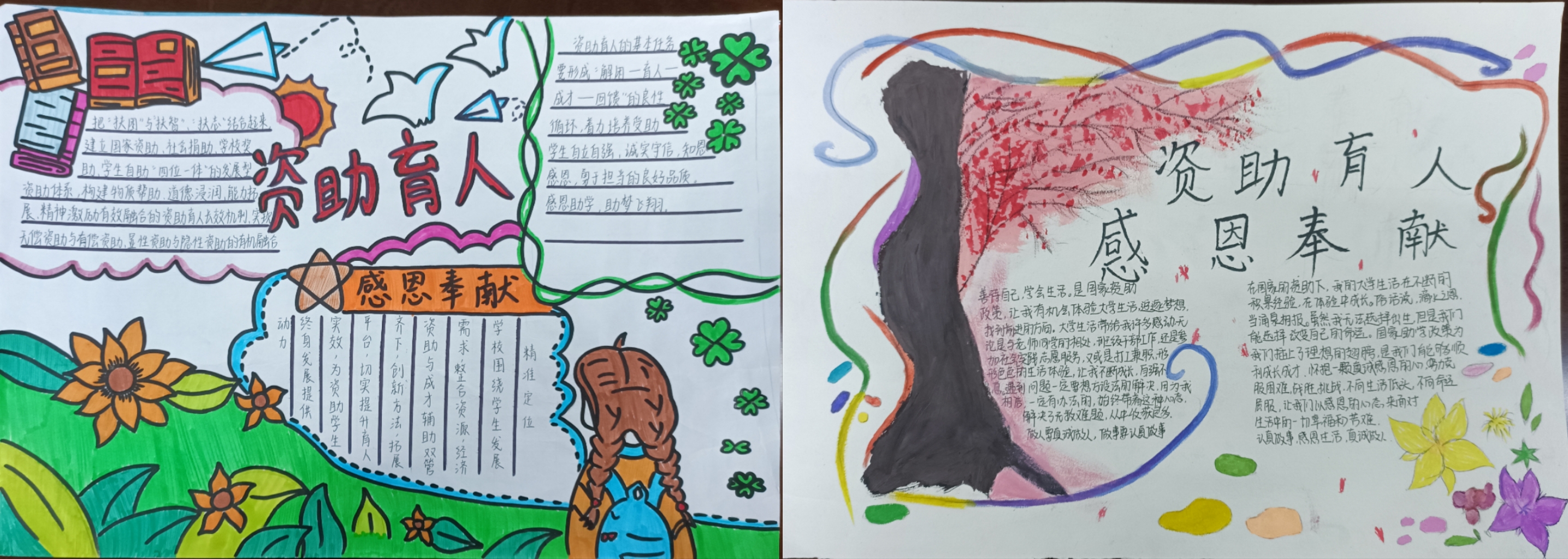 本次活动要求以初心励志、感恩奉献、崇德向善、资助育人等主题,通过剪贴画手抄报的形式表达自己对学校与国家的感恩,学生能够“贴”出心中所想,“绘”出爱的形状,以自己的巧思构想,道出爱与奉献是人类生活的永恒主题。