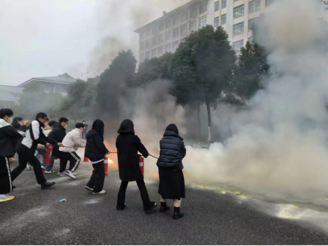 接着,实地演练了火灾的逃生技能。吴科长主导,学生积极配合,认真听取了有关安全注意事项后,随着警报的响起,老师以及同学迅速到达指定位置,指导学生有序快速疏散。吴科长带领学生根据演练方案中规定的路线,弯着腰,用纸巾等捂住口鼻,俯着身子,沿着指定楼梯口快速前进,有序撤离到安全地带并及时清点人数。整个演练过程紧张有序、实用性强,收到了预期效果。
