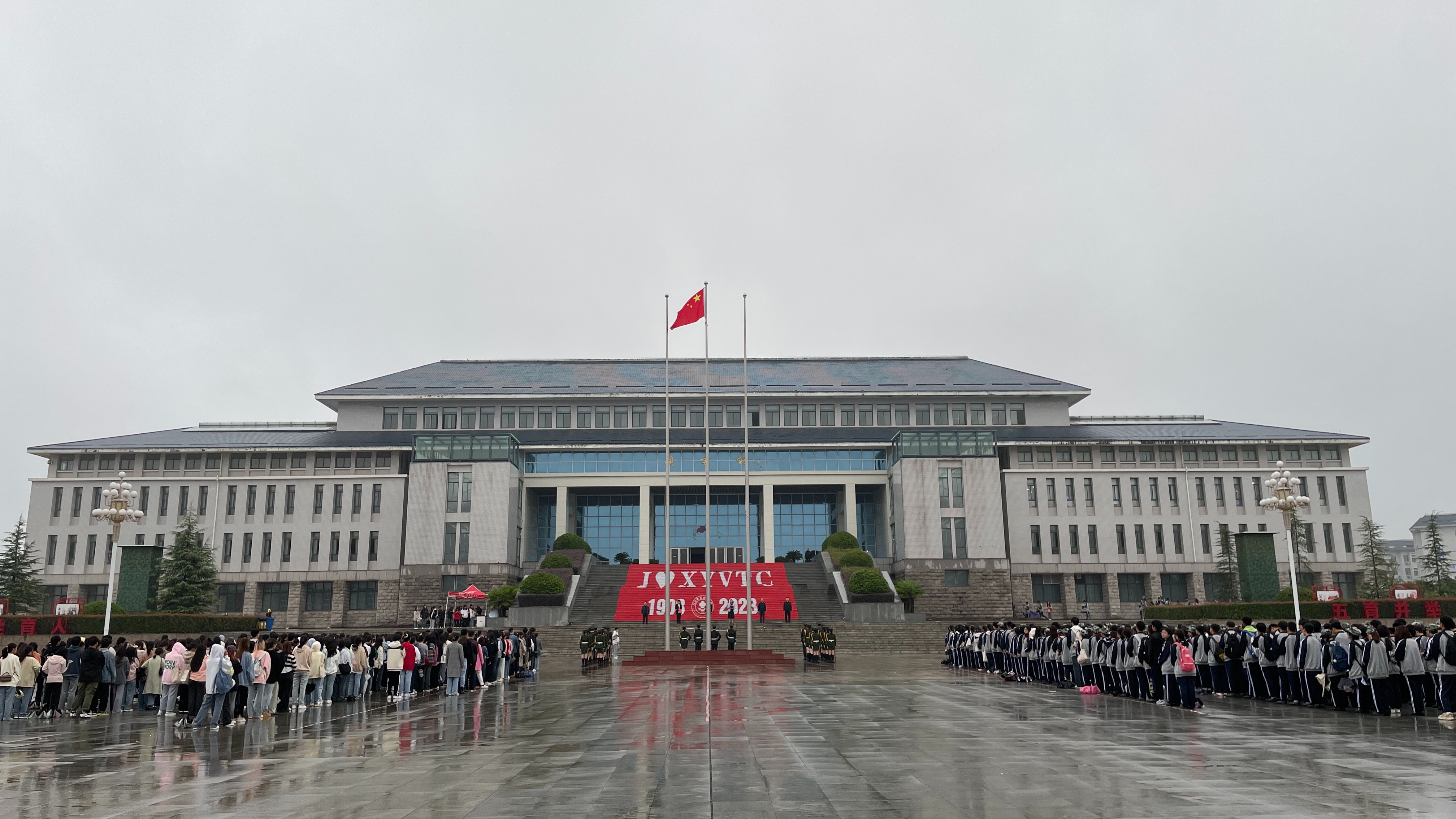 早上6:58分学校国旗护卫队迈着整齐的步伐走向升旗台,7:00整伴随着雄壮的《义勇军进行曲》,鲜艳的五星红旗冉冉升起,全院师生怀着敬意,列队肃立,齐唱国歌,表达对祖国的无限忠诚与热爱。