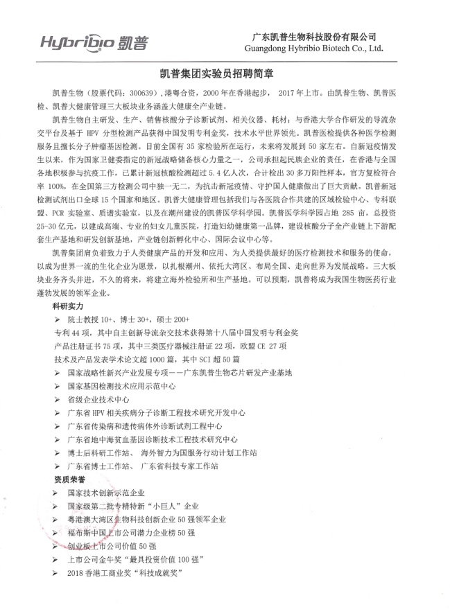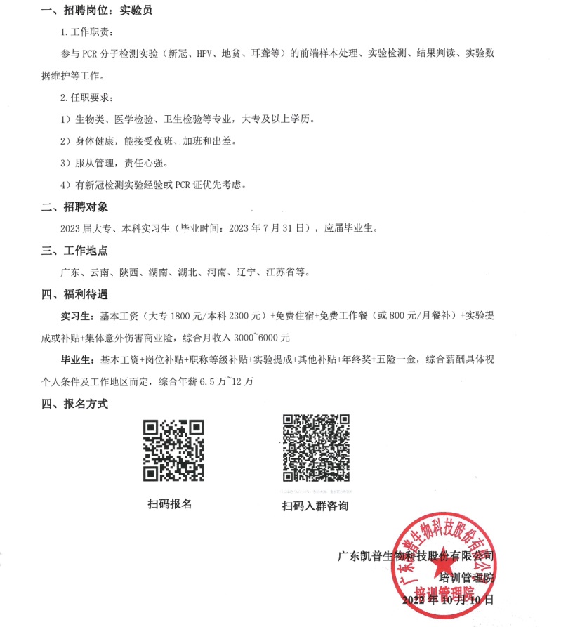 广州凯普集团实验员招聘简章